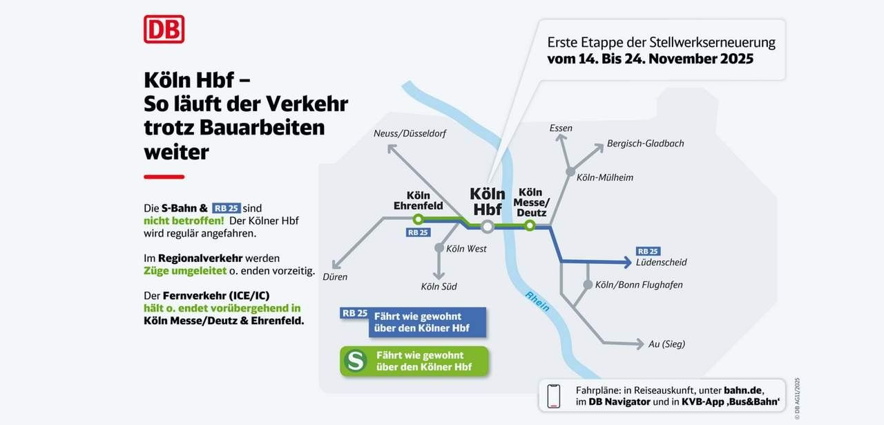 Über zehn Tage im November wird der S-Bahn-Verkehr samt RB 25 uneingeschränkt zum Kölner Hauptbahnhof durchgeführt. Regionale Züge außerhalb dieser Linien werden vorübergehend umgeleitet oder verkehren mit vorzeitigem Endpunkt. Fernverkehrszüge wie ICE und IC umgehen in dieser Phase den Hauptbahnhof und bedienen stattdessen Köln Messe/Deutz sowie Ehrenfeld. Für eine reibungslose Reise stehen aktuelle Abfahrts- und Ankunftsinformationen in der DB Navigator-App, auf bahn.de und in der KVB-App „Bus&Bahn“ bereit.